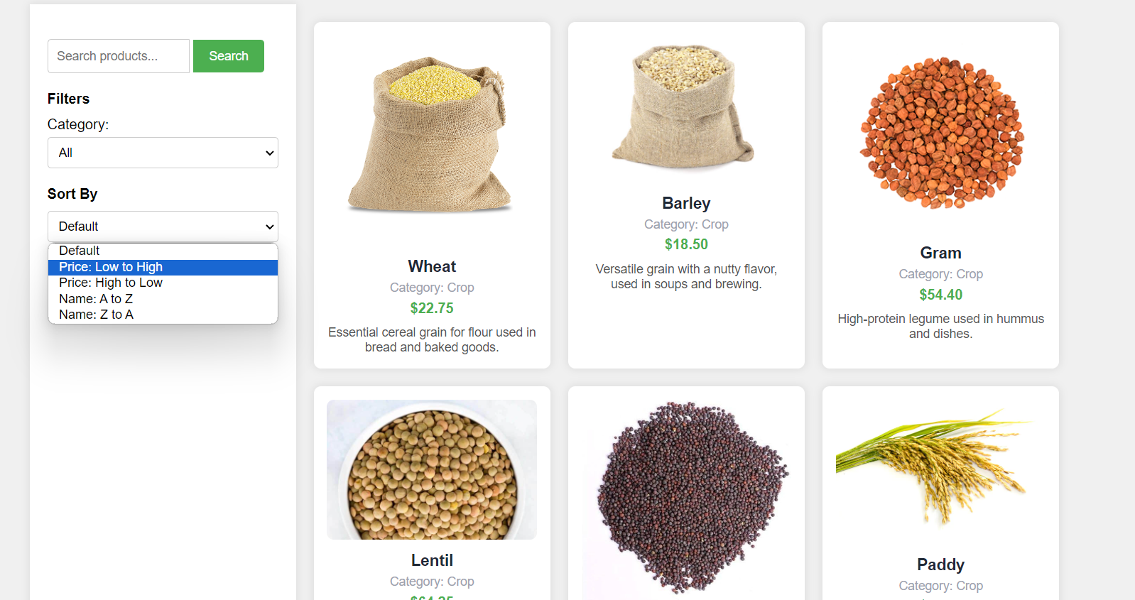 Farming materials with search, filter, and comparison features